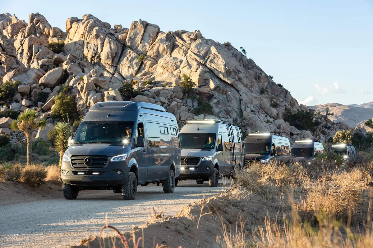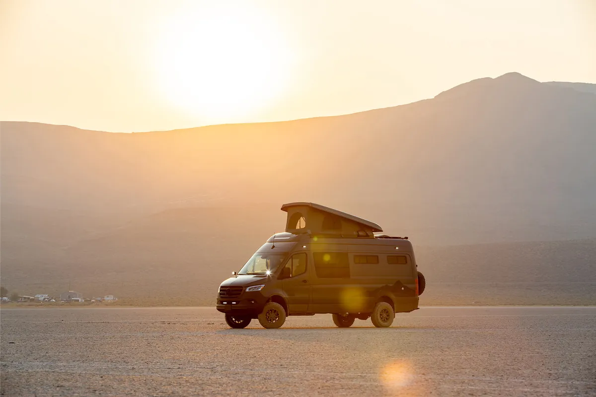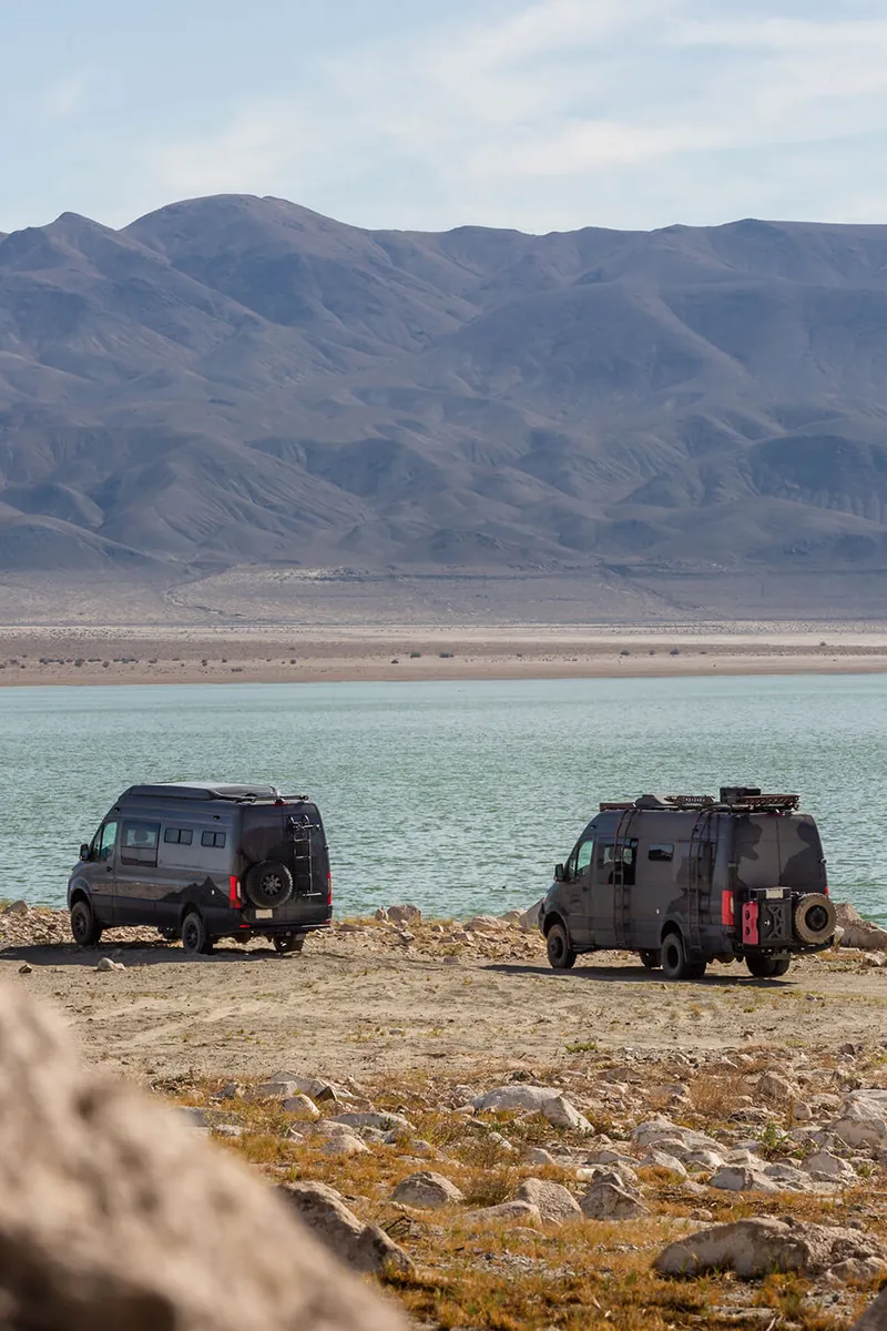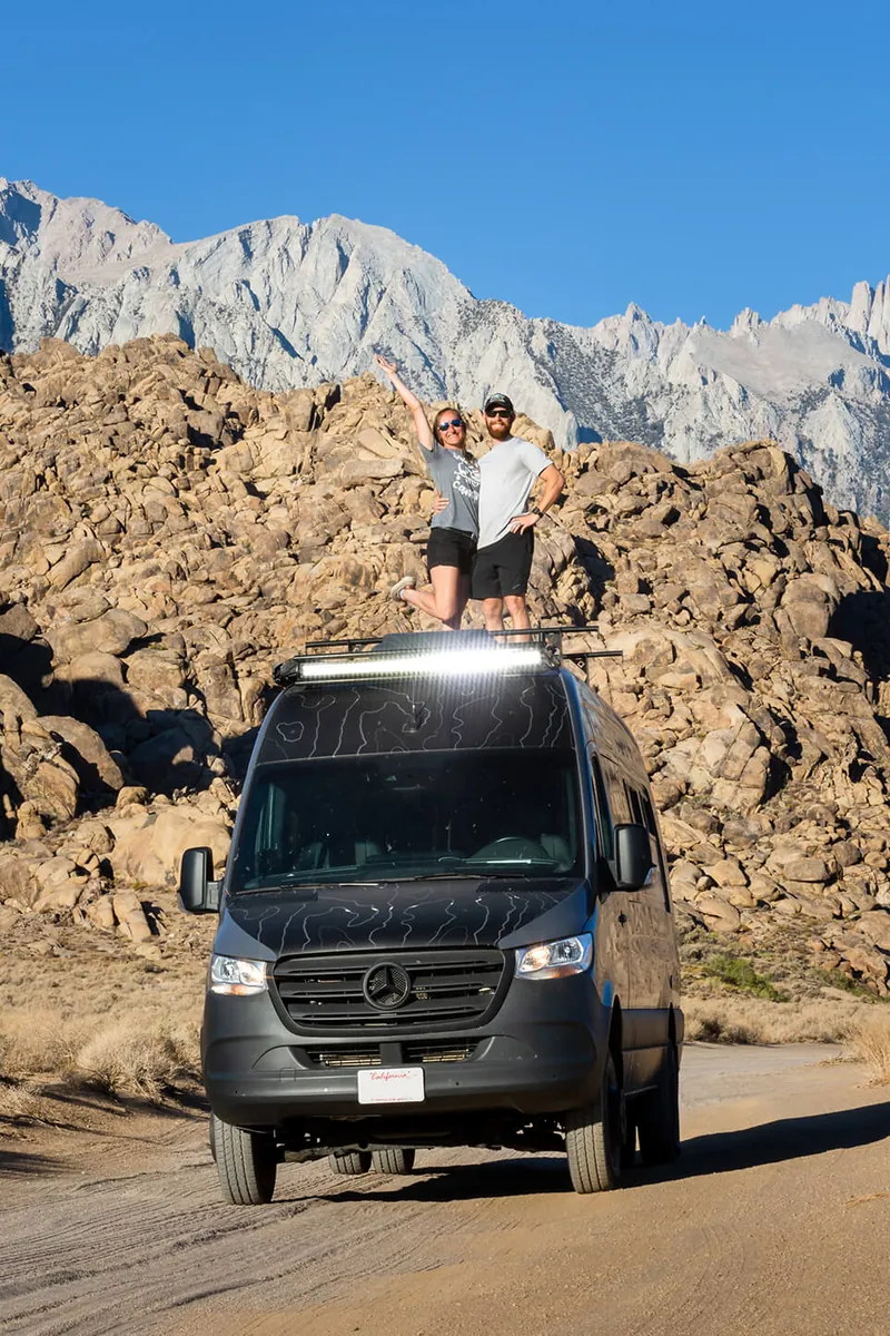 Wanting to capture engaging footage without having specific locations in mind, the team utilized iOverlander to help decide their next coordinates. They enjoyed not having a rigid plan or itinerary, allowing them to go with the flow and adapt to changes on the road, which is something you can do with a van when not worrying about campsites, hotels, etc. The uncertainty led to spontaneous adventures and unplanned stops turned out better than expected. Outside of Unionville, Nevada the vans pulled into their spot as the sun was setting. Thanks to exterior lights, they were able to settle in smoothly but didn’t know what the site was like until morning. Waking up to an expansive lakebed in-front with a peaking mountain range in the distance and rain clouds starting to form wasn’t a bad way to start the day. Fully rested, the team headed further south toward the Alabama Hills, California to meet Command Post.