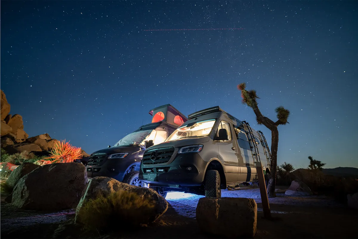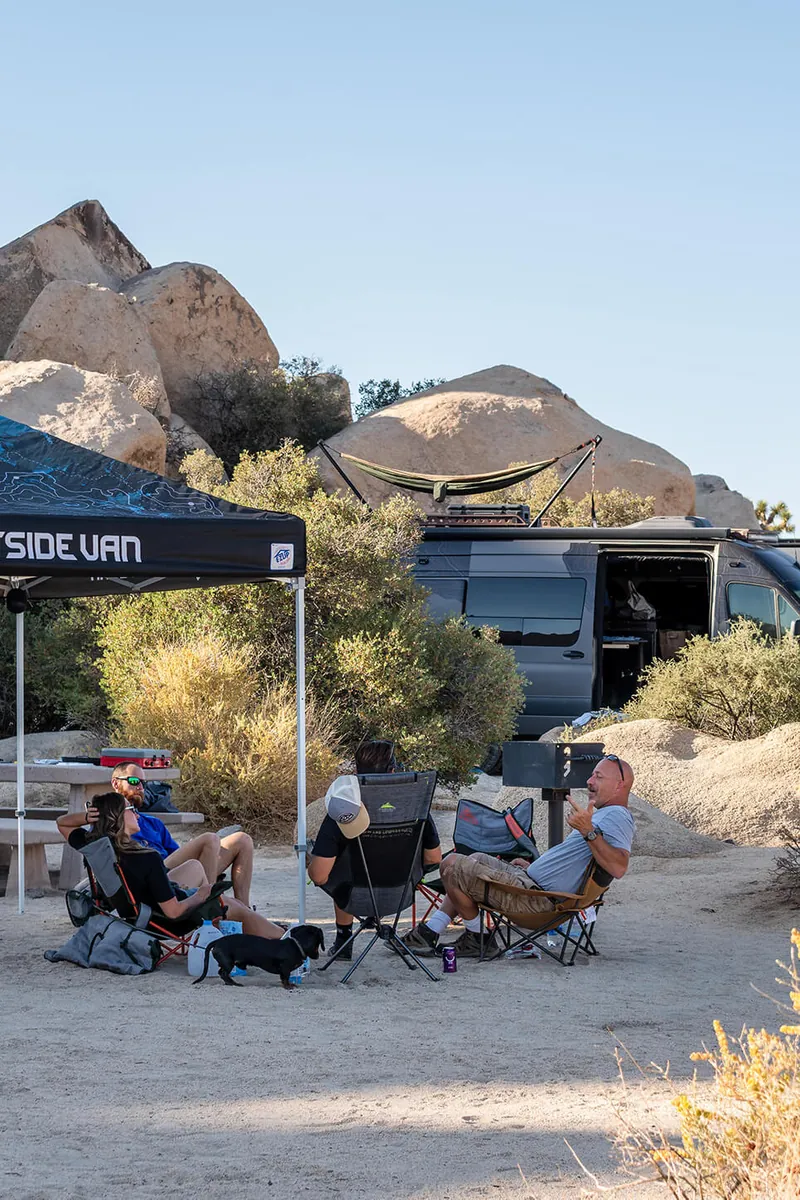 They convoyed with Command Post to Joshua Tree where Rip Tide and Muléke would rendezvous with the group. If you’ve been to Joshua Tree during the summer you know how busy their first come, first served camping can be. The team braved the totally packed and cramped sites, creeping along slowly so as not to miss an opening or exiting vehicle. Finally, on the very last road two spots were open. Parked with precision, Command Post and Launch Pad shared a spot, while Lunarnova, Rip Tide, and Muléke occupied the second. Our sites received inquisitive looks, curious questions from neighbors, and lots of approving head nods. When the team wasn’t discussing van life, dream modifications, and upcoming destinations, it was nice to chat with people who weren’t familiar with our work. The look of surprise the crew received when detailing just how custom the vans are is always rewarding.