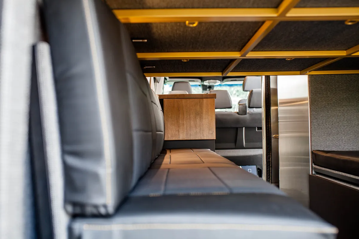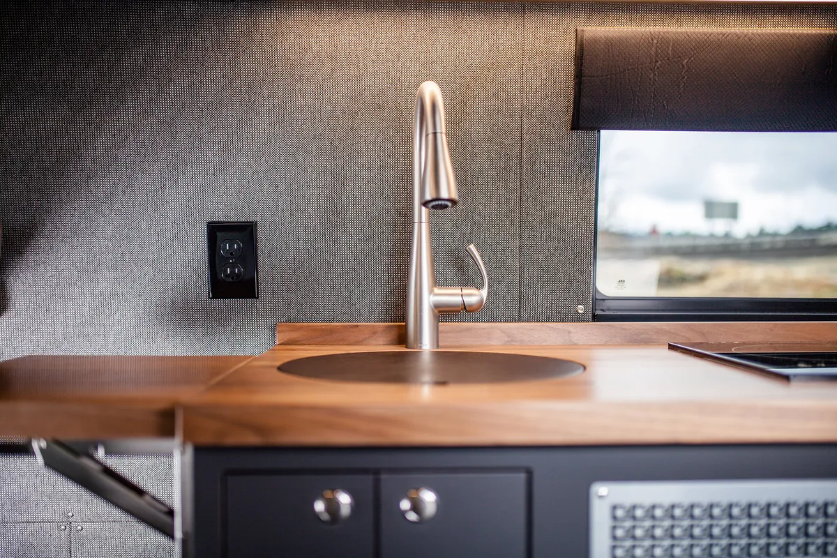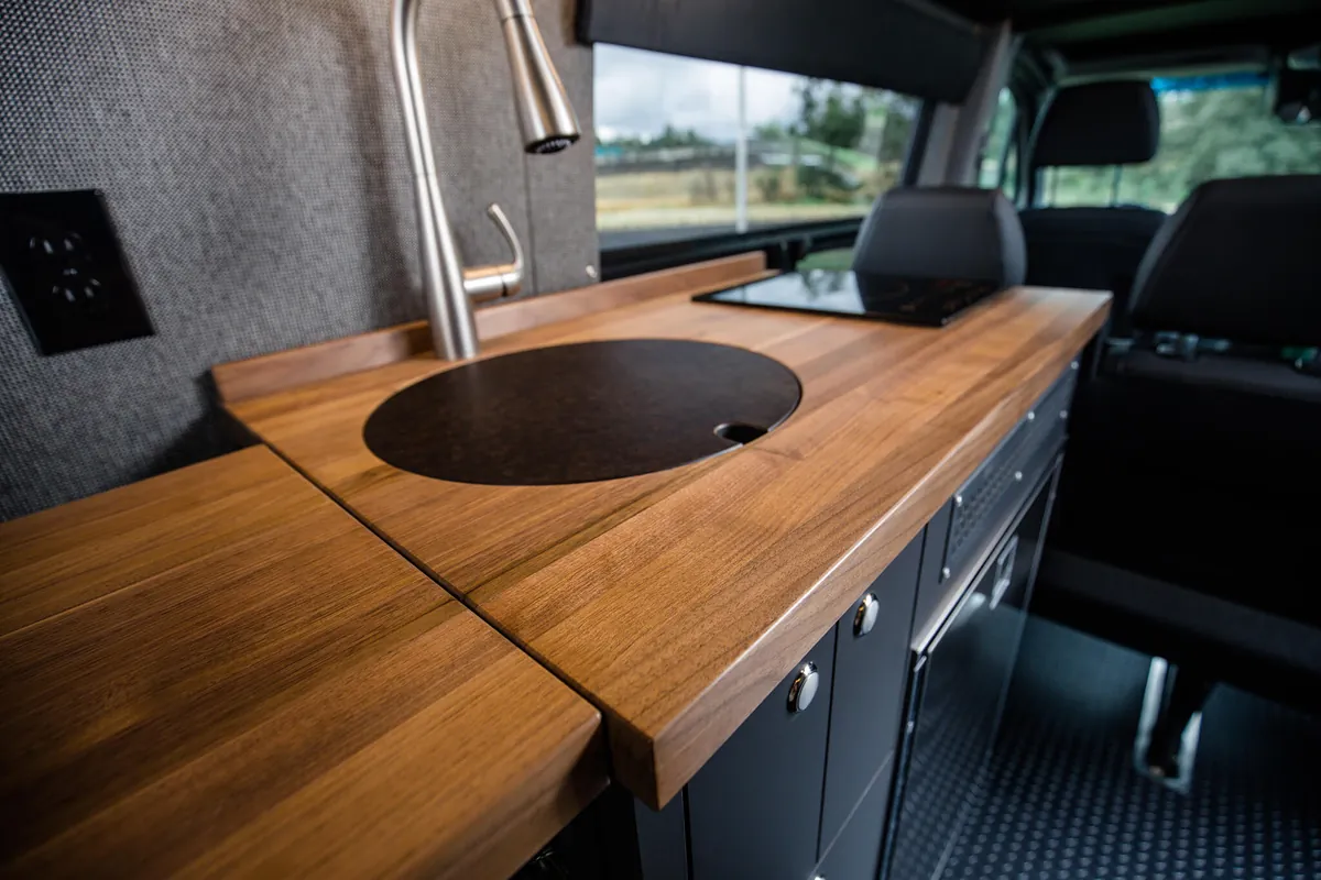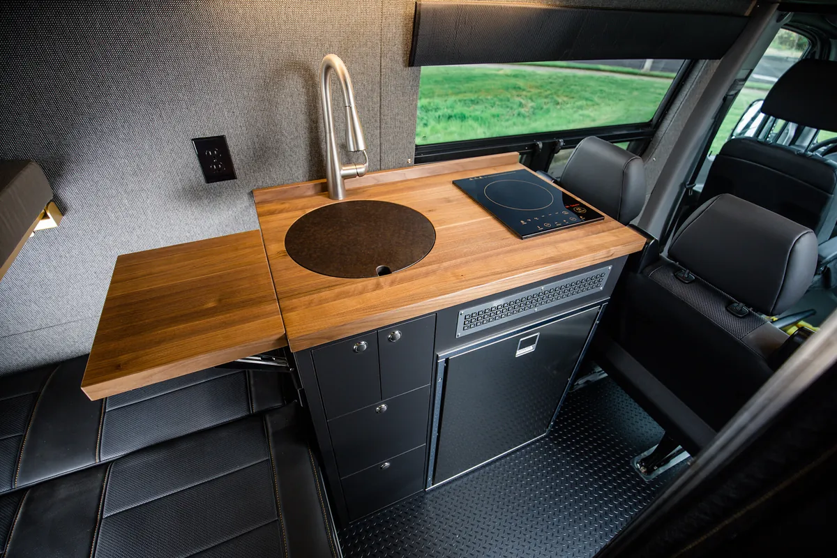 With a fully enclosed shower, getting clean in the privacy of the van has never been easier. The kitchen is stocked with a deep stainless steel sink, an induction cooktop, and a refrigerator.