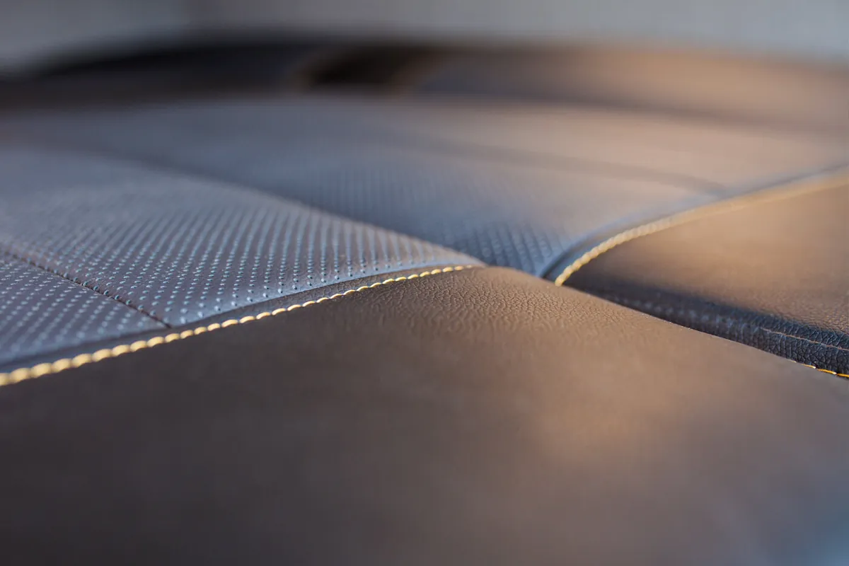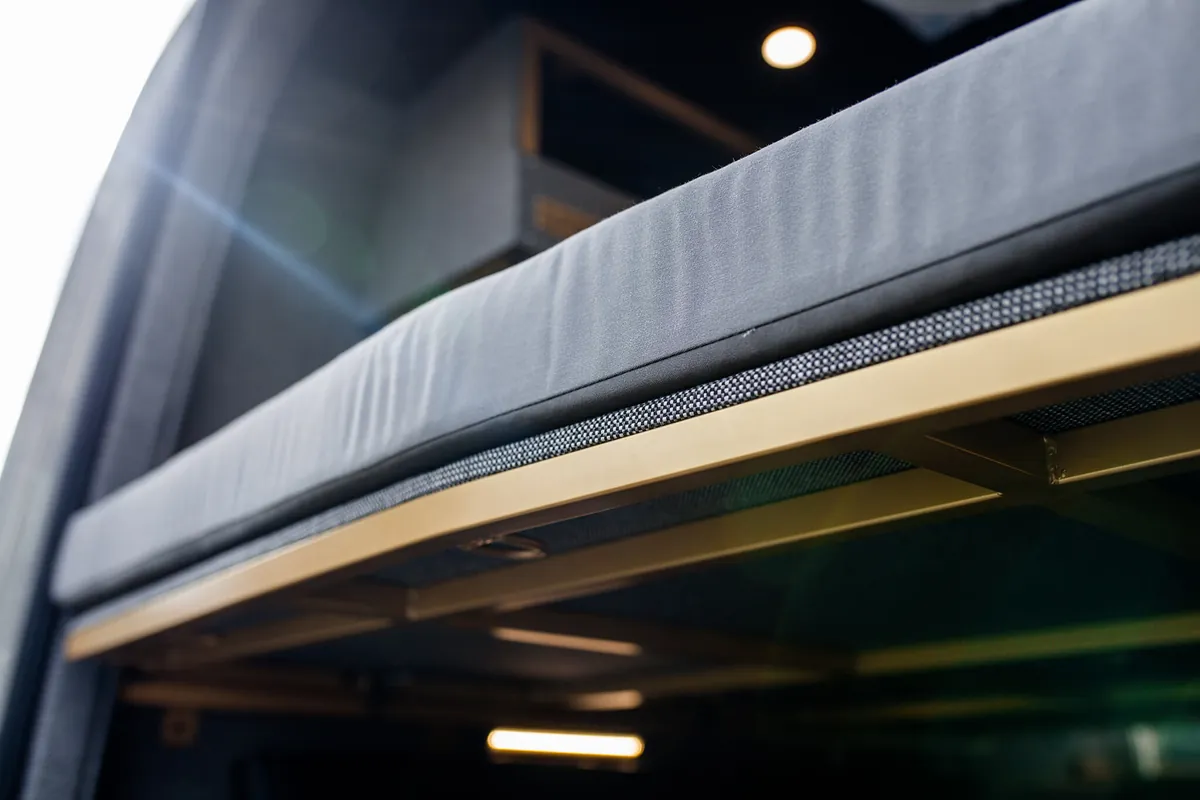 This stone grey 170 has an elegant yet rugged interior. The three panel bed provides a comfortable and large sleeping area, and the sliding benches in the rear provide double the sleeping space. When the three panel bed is removed, the sliding benches in the rear can be used as a great spot to sit and hang out.