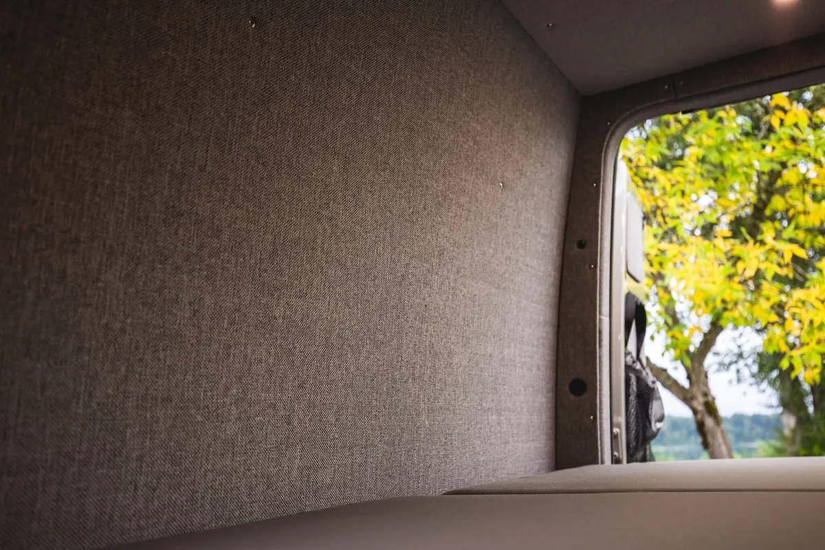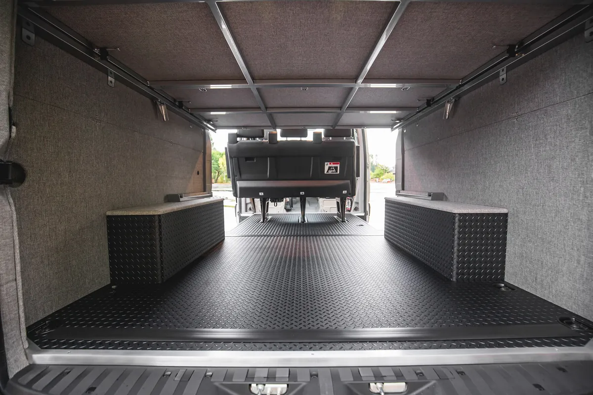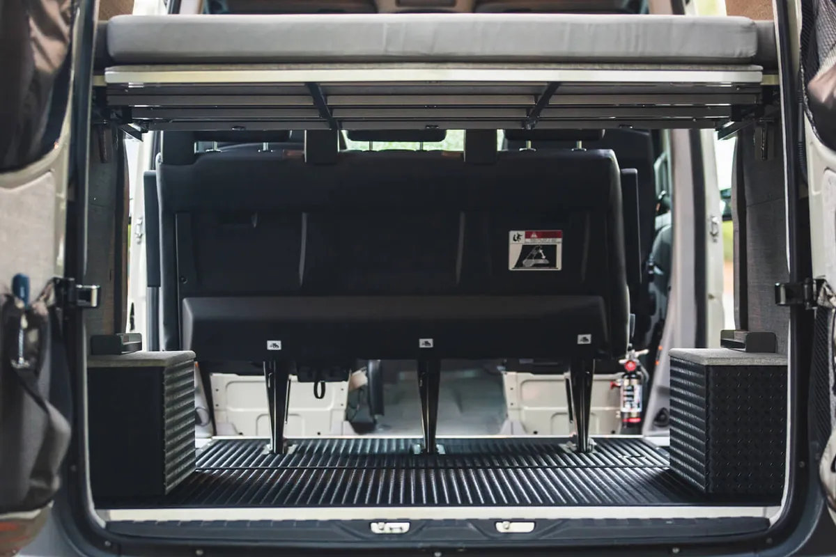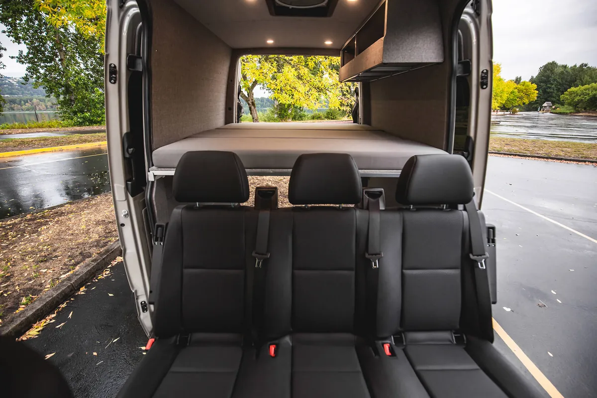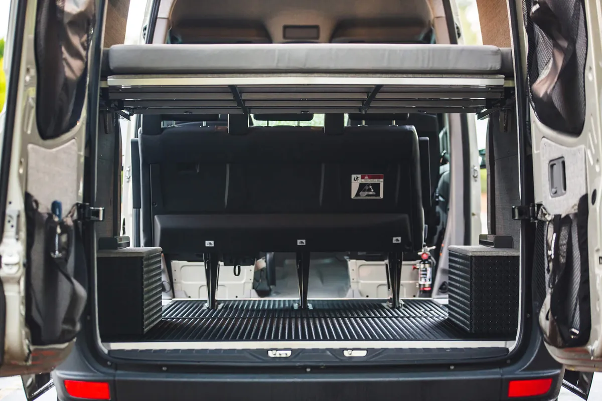 Alfresco is a custom Peak Series van built in 2019. With dual sliders that allow entry or exit on either side and plenty of airflow, this simple build features an easily removable three person bench seat, as well as a removable three panel bed that has the option to convert into a sofa. With l-track, an exoskeleton cabinet, and rear door stuff sacks for gear storage, this van provides our customers an easy way to gear up and get out with their family and friends.