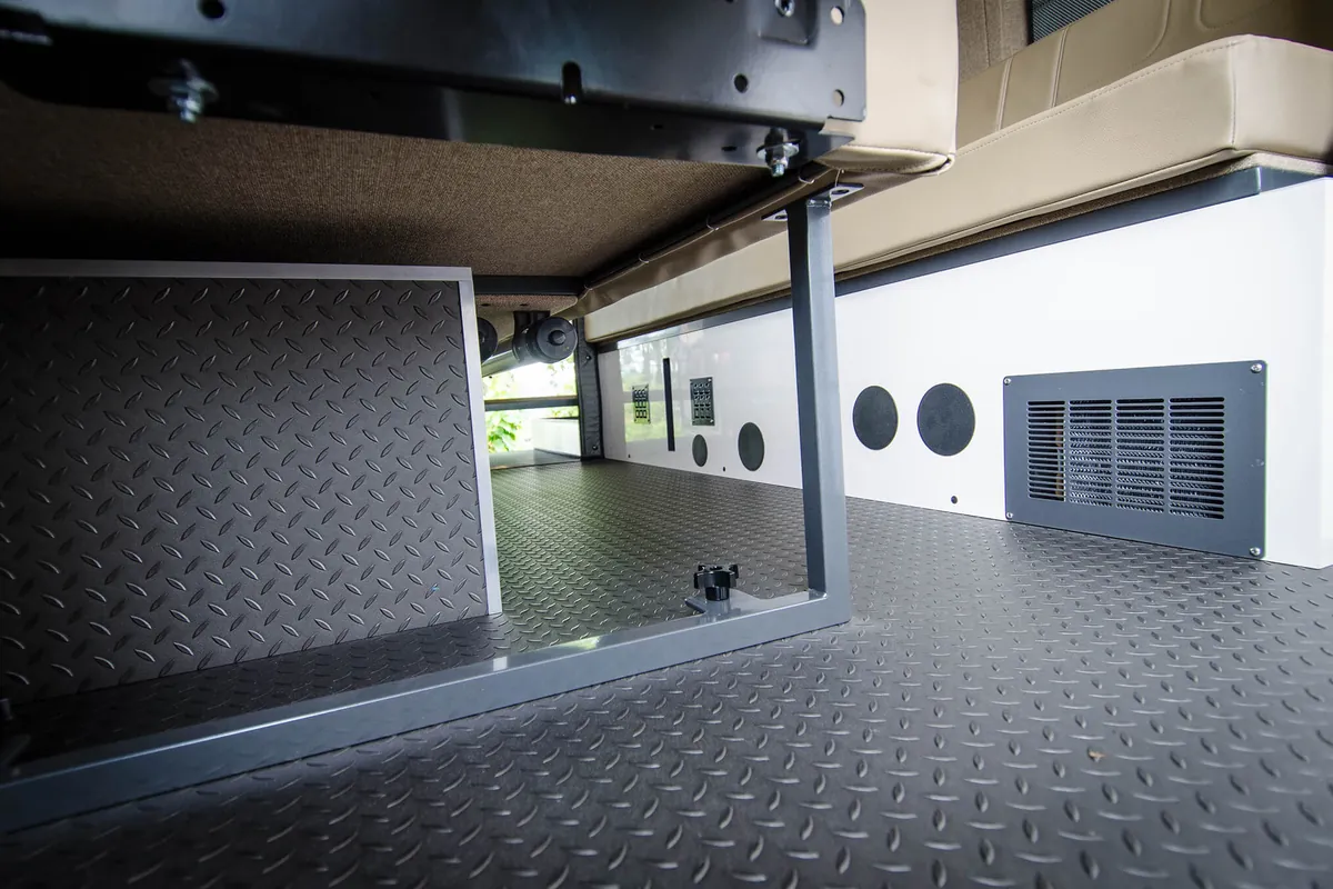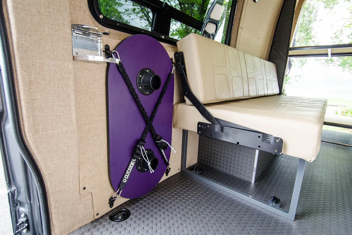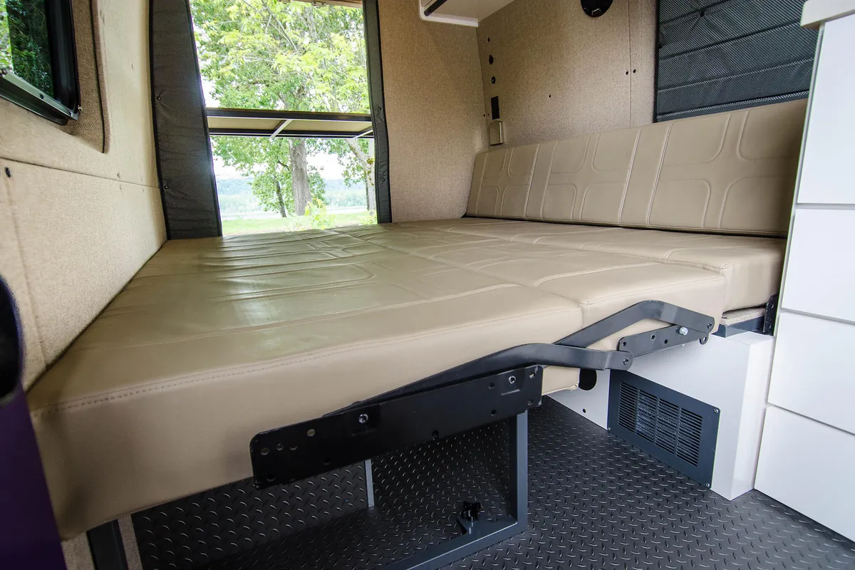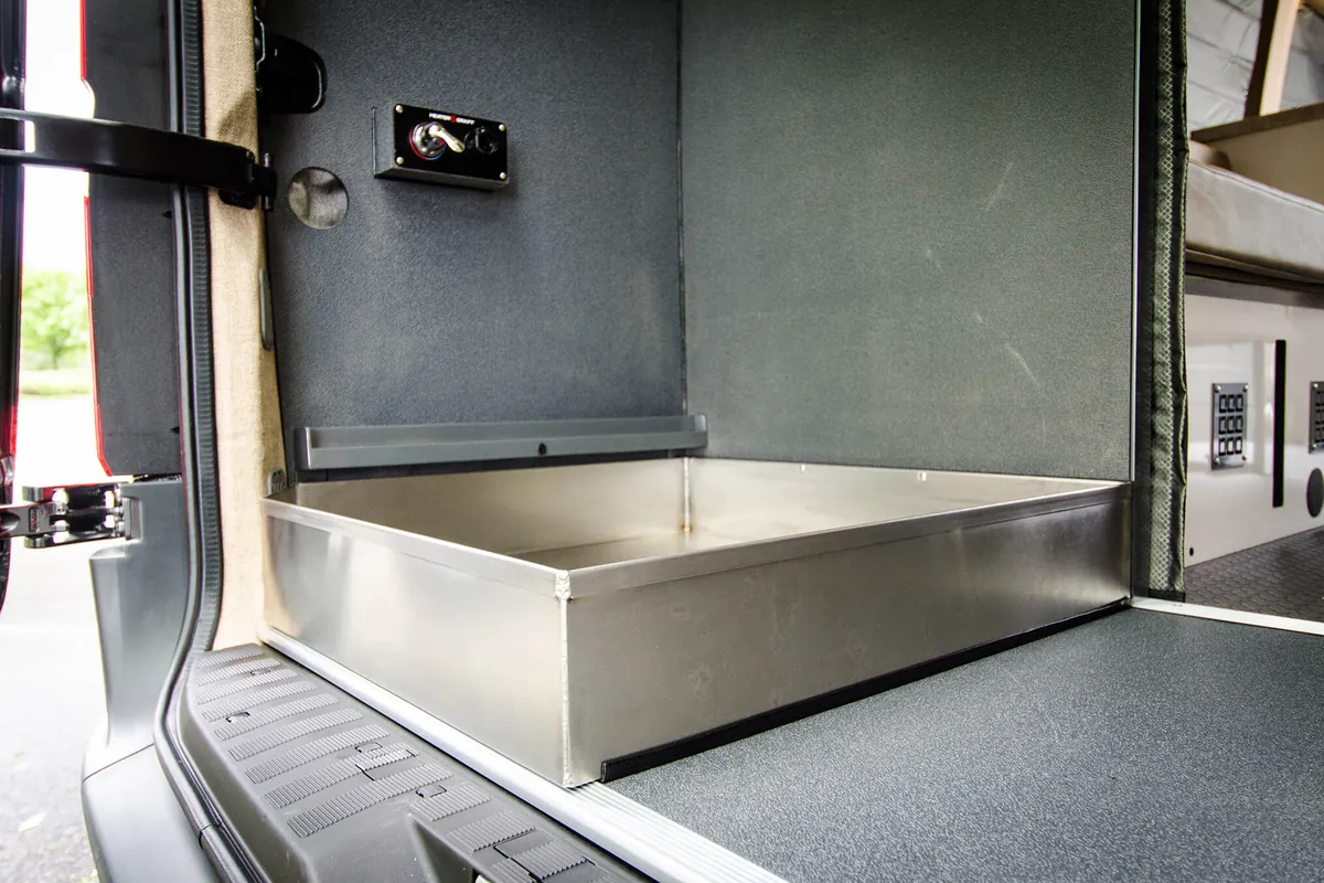 Built in 2015, Crawdad is the perfect setup for family adventure. With four seats and sleeping in the main living area for two (thanks to the folding couch that creates a large sleeping platform), and two more in the garage area with bunk-style platforms. The removable shower in the garage takes up minimal space, but provides a private and warm place to get clean all year round.