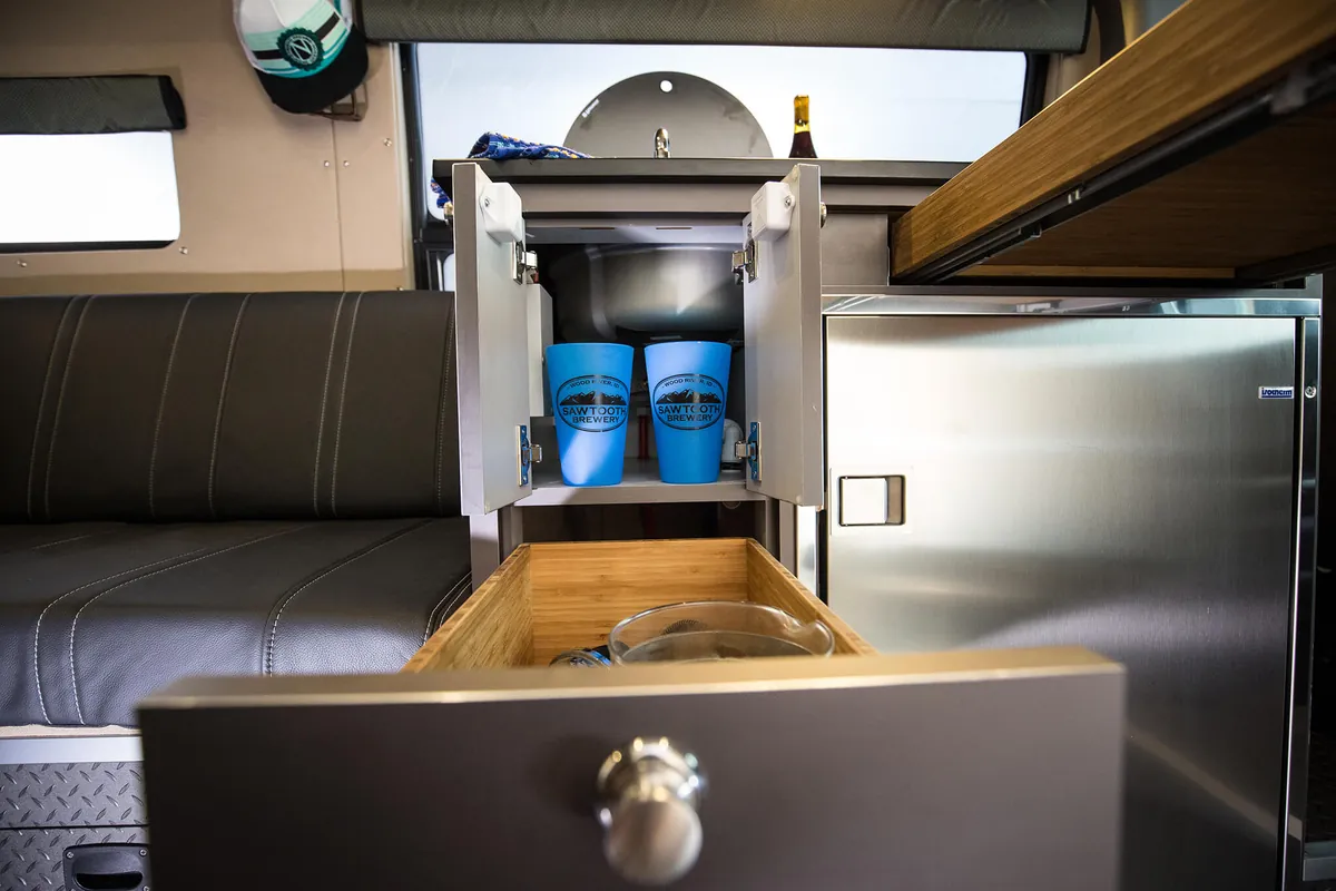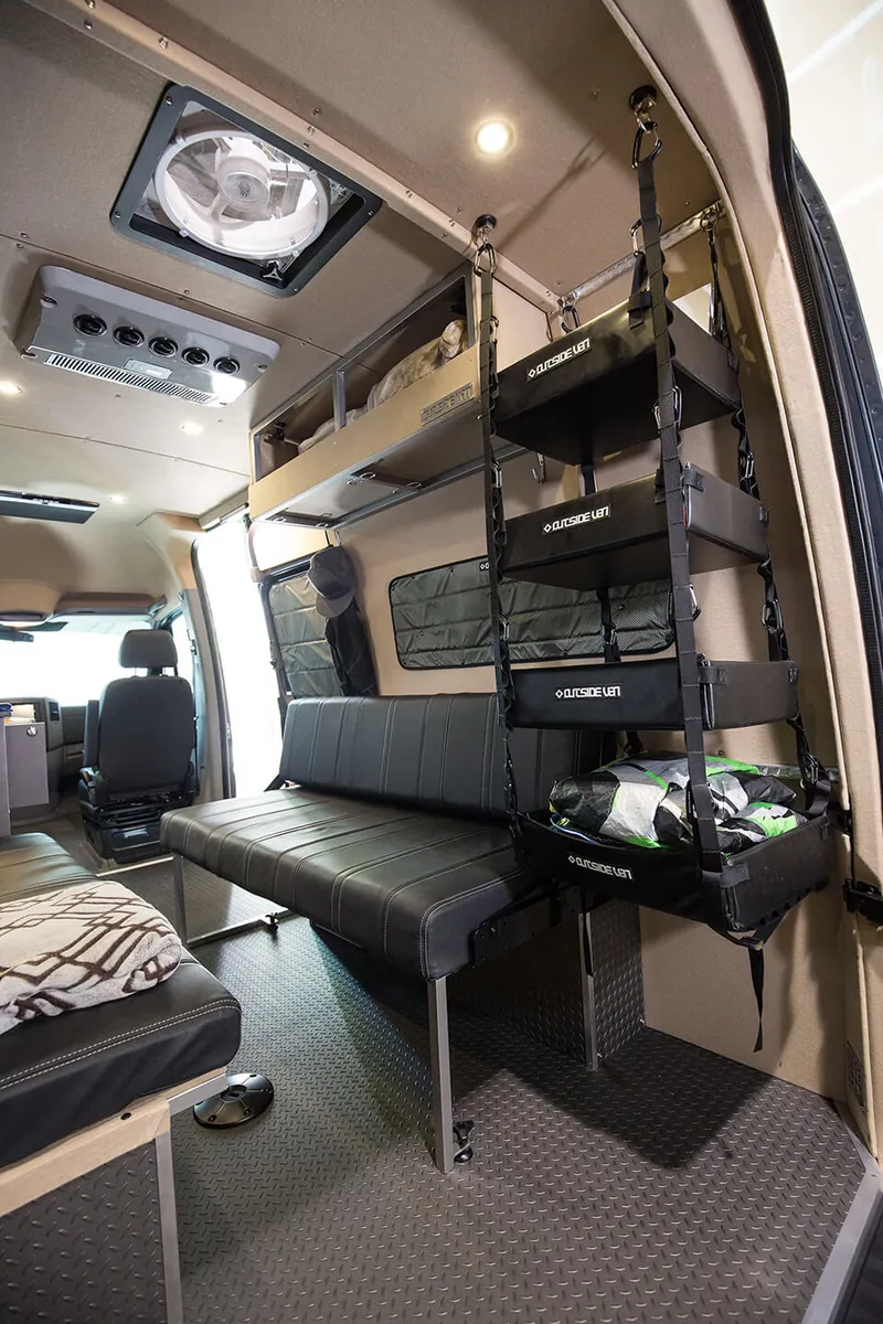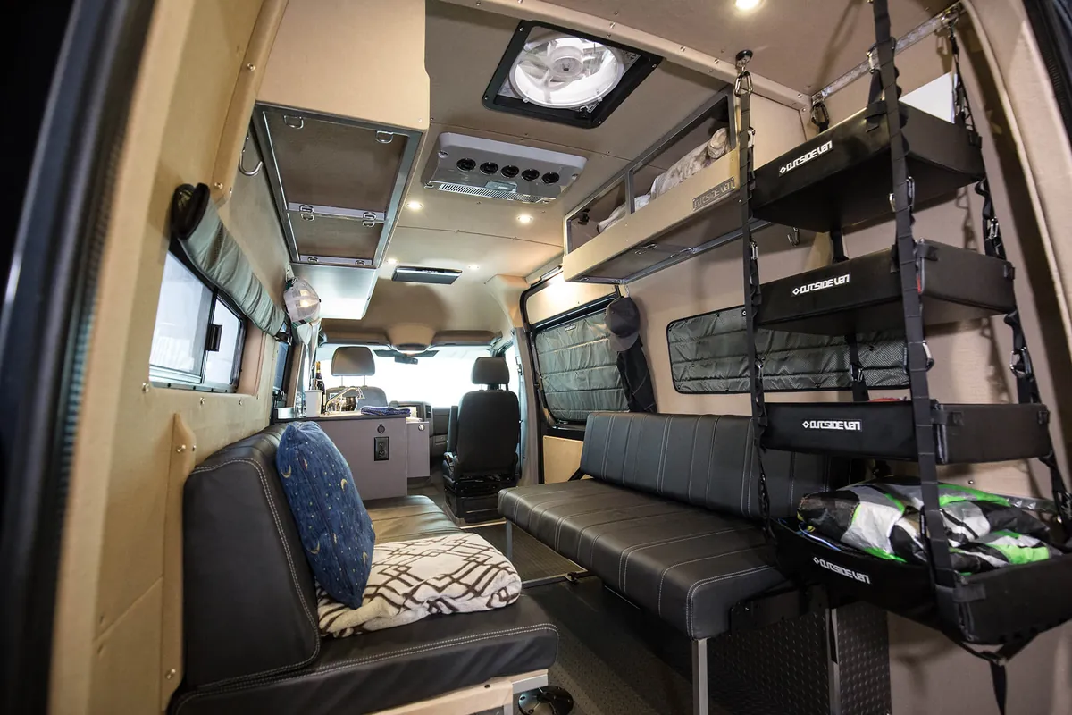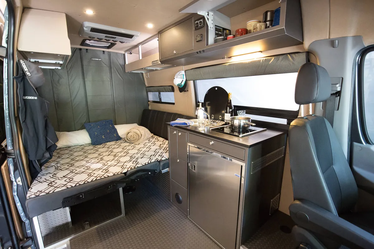 Our custom Sprinter vans are engineered to provide the ultimate van life camping experience, combining the legendary reliability of Mercedes-Benz with camping-specific modifications. Experience the freedom of the open road as your Sprinter camper van transforms into your home away from home. With specialized features for camp cooking, off-grid camping, including sustainable power solutions and efficient storage, an Outside Van ensures that your camping adventures are comfortable and convenient. Our camper vans are also outfitted with tailored storage solutions to organize and haul any gear you need for whatever you enjoy doing during your vanlife camping trips, from hiking to fishing to just making s’mores around the campfire.