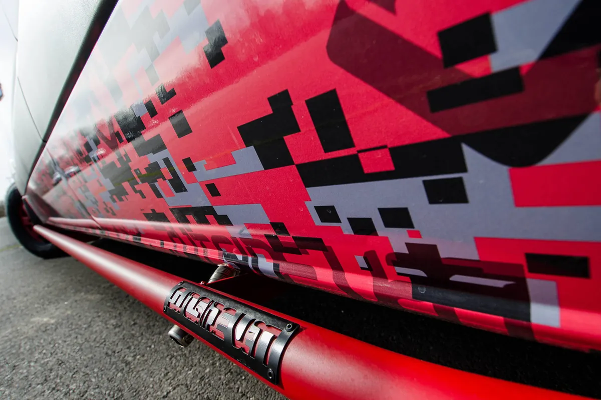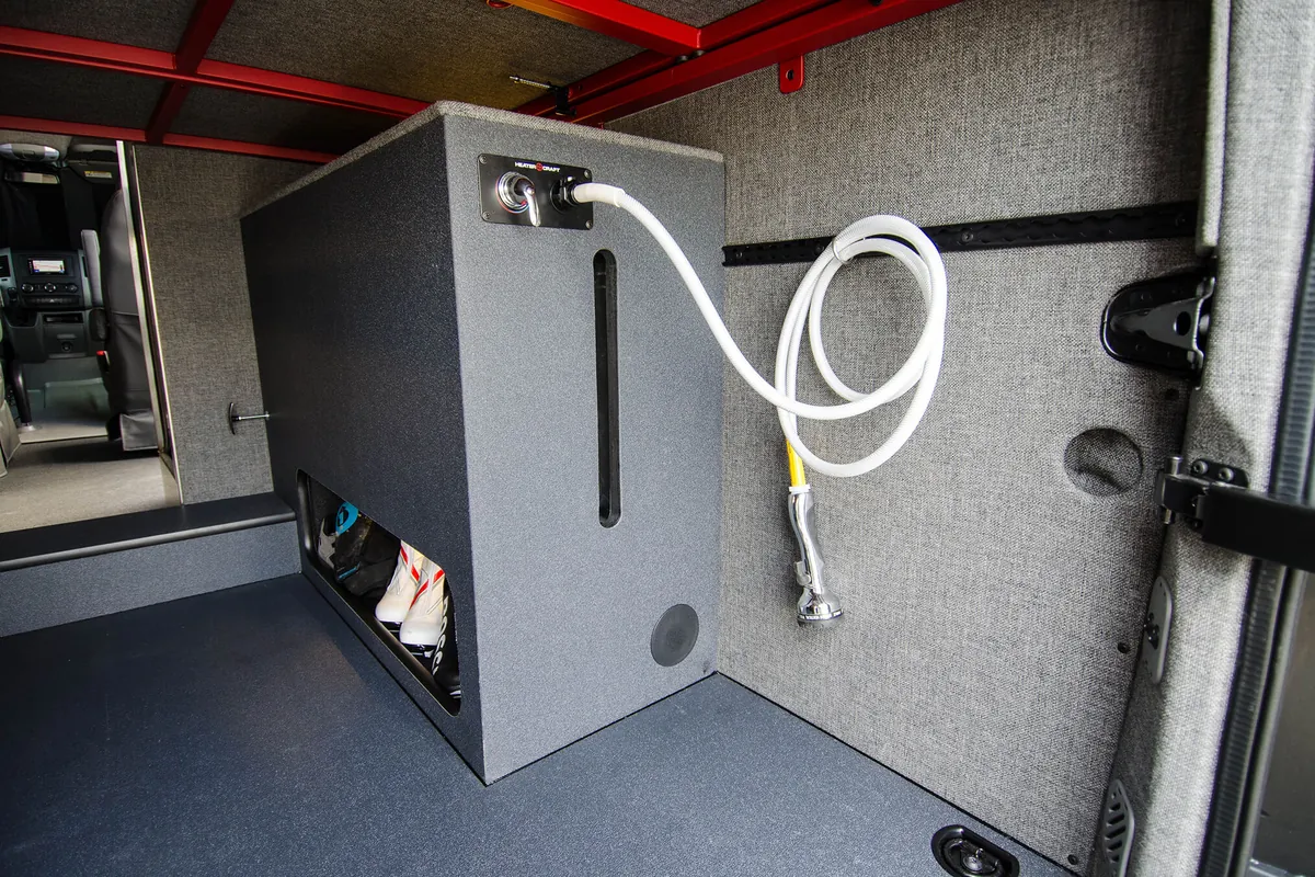 Built in 2015, Karma is a custom Peak Series van that has an enclosed shower, removable bed, galley with sink and fridge, as well as bike and ski storage in the rear garage. With two captain’s chairs, our customer can bring friends along for the ride.