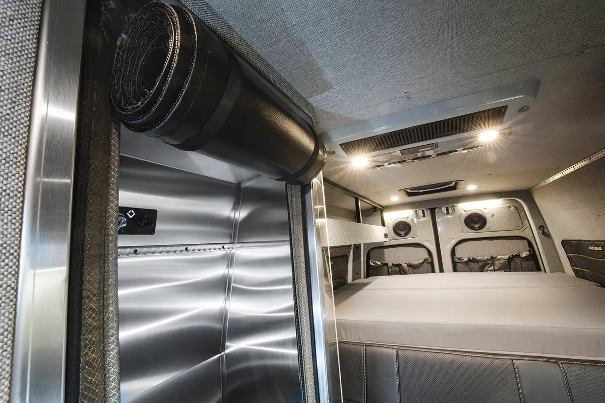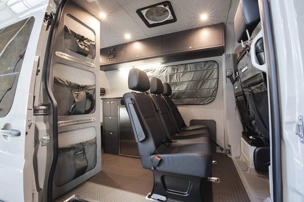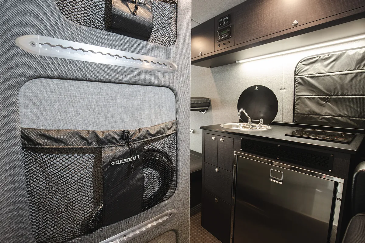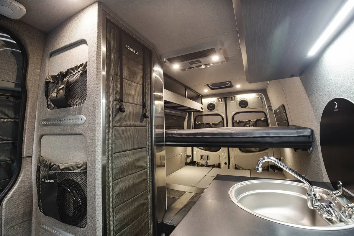 Our custom Sprinter vans are engineered with the perfect blend of ruggedness and comfort, specifically crafted to accommodate your trail running gear and provide a comfortable space for rest and recovery after you finish a run. With specialized storage solutions for trail running camping trips, your van transforms into not just transportation but also a mobile base camp to keep clean, relax, and refuel.