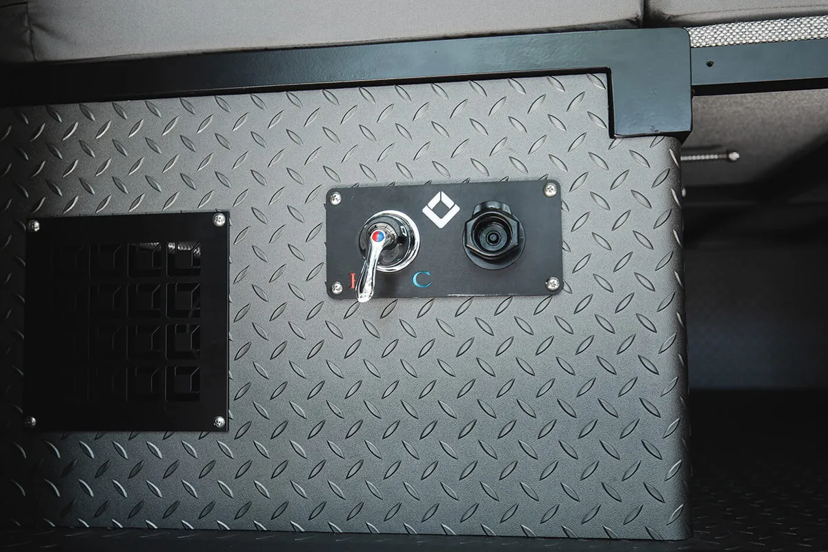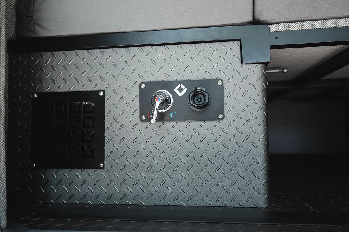 Built in 2018, Landshark is a Peak Series custom build that was designed for our customers that wanted space for the whole family. It features seating and sleeping for five, with an upper four panel bed that hinges to create a backrest for the lower bed below, all topped with custom upholstered cushions. The custom fully enclosed aluminum shower has hot and cold running water, as well as storage pockets on the exterior. The large galley has an induction cooktop, sink, and refrigerator. Two high output AGM batteries, paired with a 125 watt solar power, provide power to the rooftop aftermarket A/C and all other components. Finished with Mandrus Atlas 17″ Wheels with BFG K02 tires, this 4×4 vehicle can conquer just about any terrain.