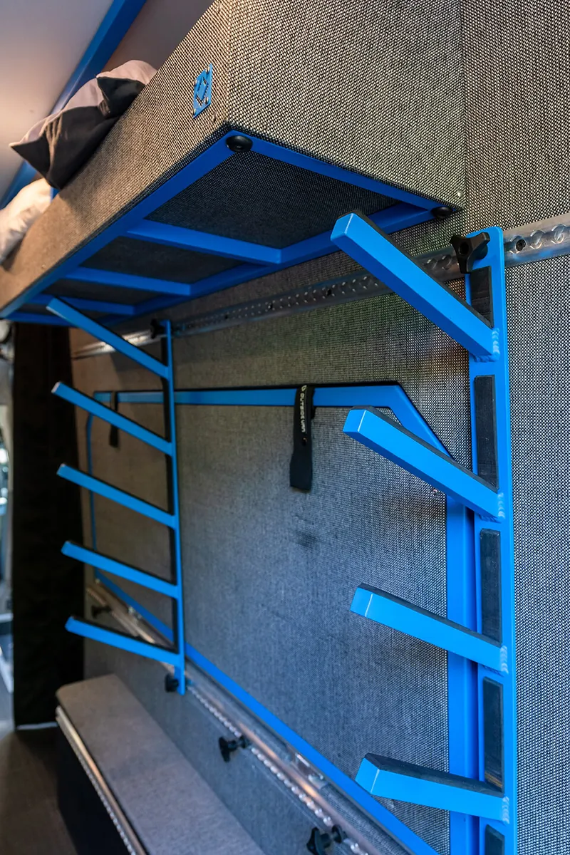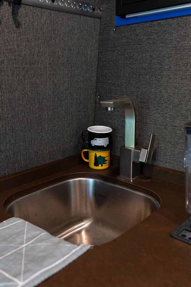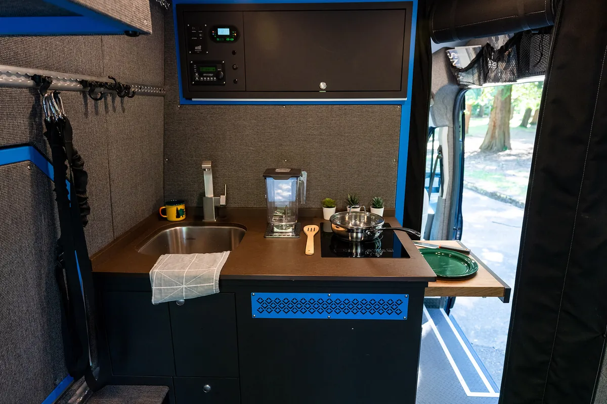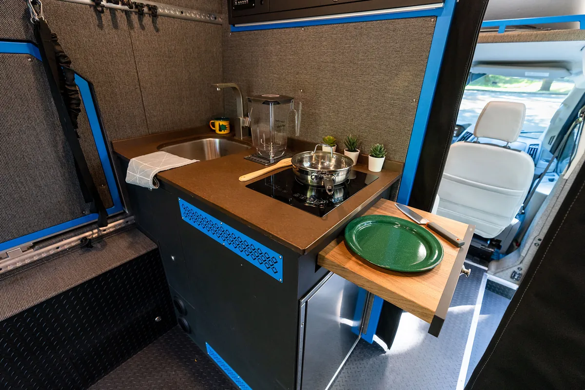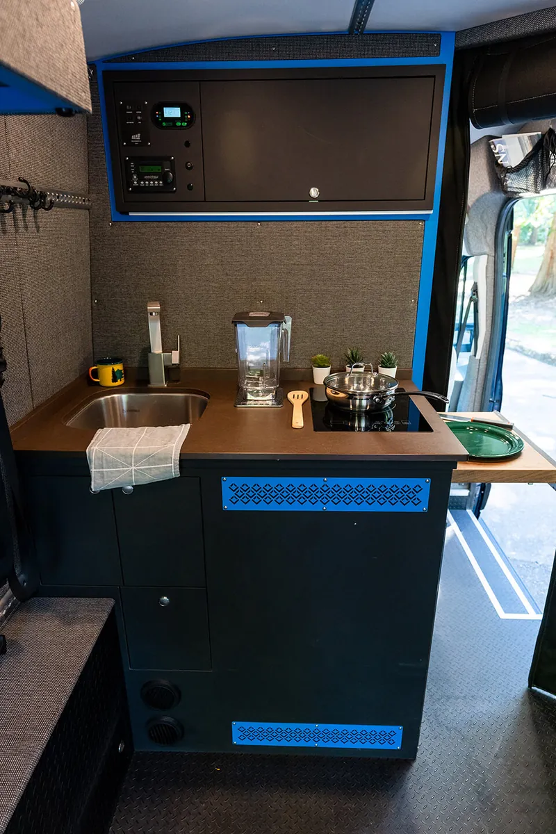 We designed two removable bunk beds that fold down to provide a comfortable sleeping space for two. Once it’s time to rise and shine, the bunks fold up and discretely tuck away flush with the walls. Due to the extremely high roof height, surfboards can be stored directly on the ceiling while still leaving enough room to walk around. Our removable ski/board wall racks allow storage for a plethora of equipment. The galley kitchen is equip with a deep stainless steel sink, an induction cooktop, a built-in blender mount, and a pull out fridge. This van has everything you could ever dream of and more.