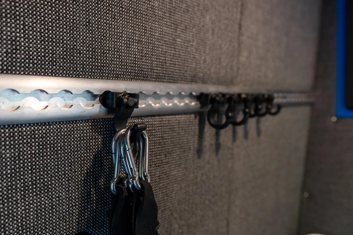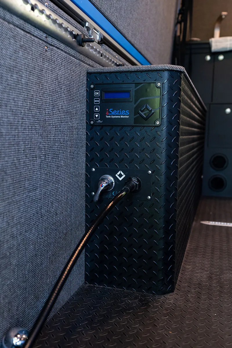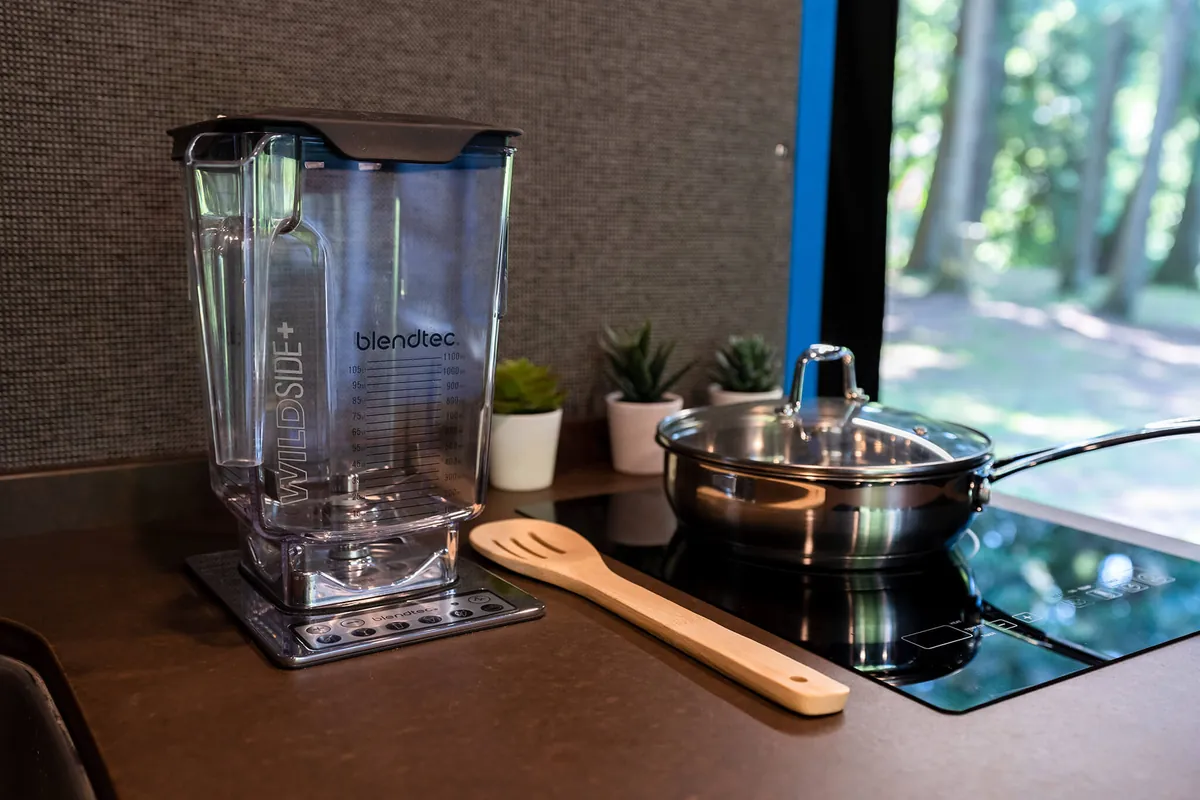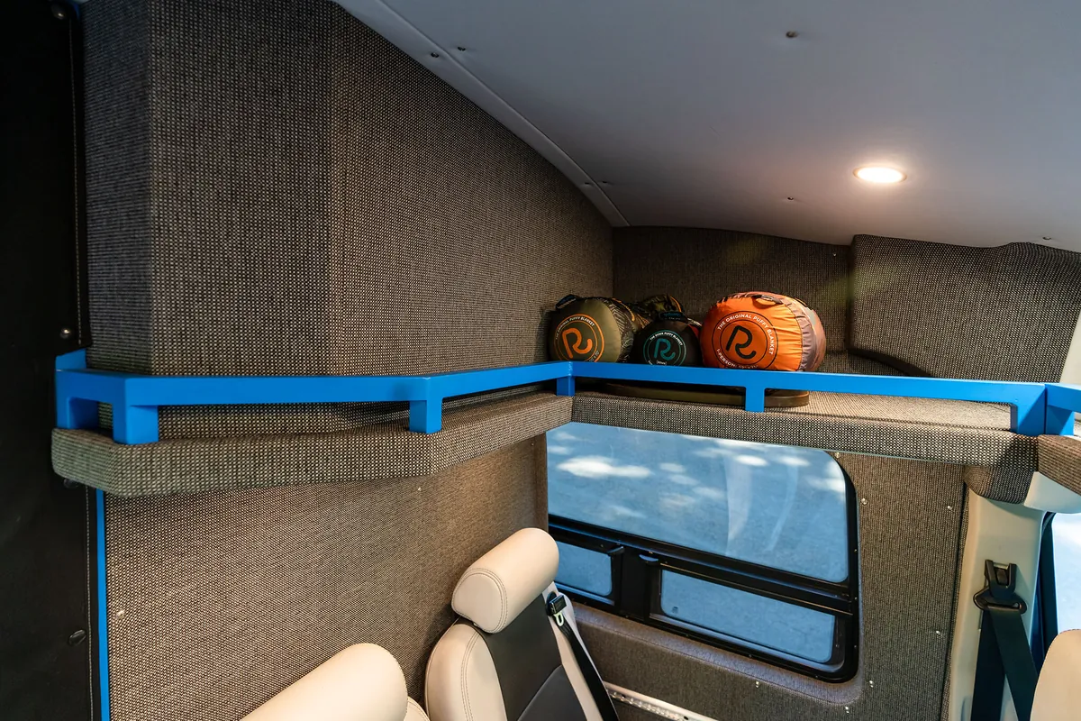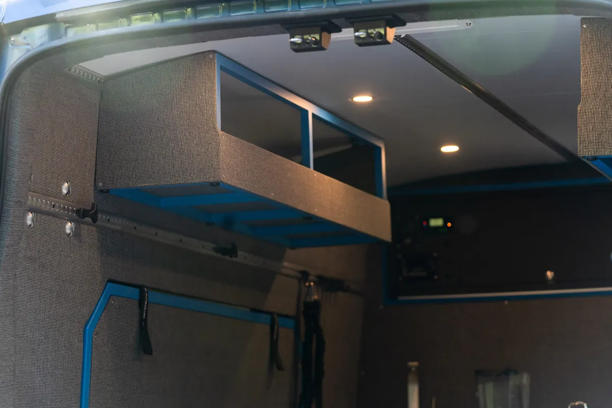 We designed two removable bunk beds that fold down to provide a comfortable sleeping space for two. Once it’s time to rise and shine, the bunks fold up and discretely tuck away flush with the walls. Due to the extremely high roof height, surfboards can be stored directly on the ceiling while still leaving enough room to walk around. Our removable ski/board wall racks allow storage for a plethora of equipment. The galley kitchen is equip with a deep stainless steel sink, an induction cooktop, a built-in blender mount, and a pull out fridge. This van has everything you could ever dream of and more.
