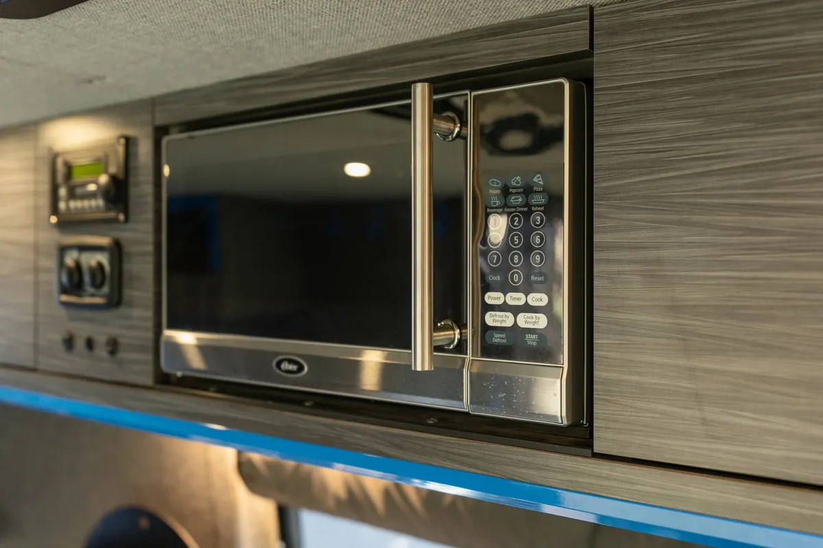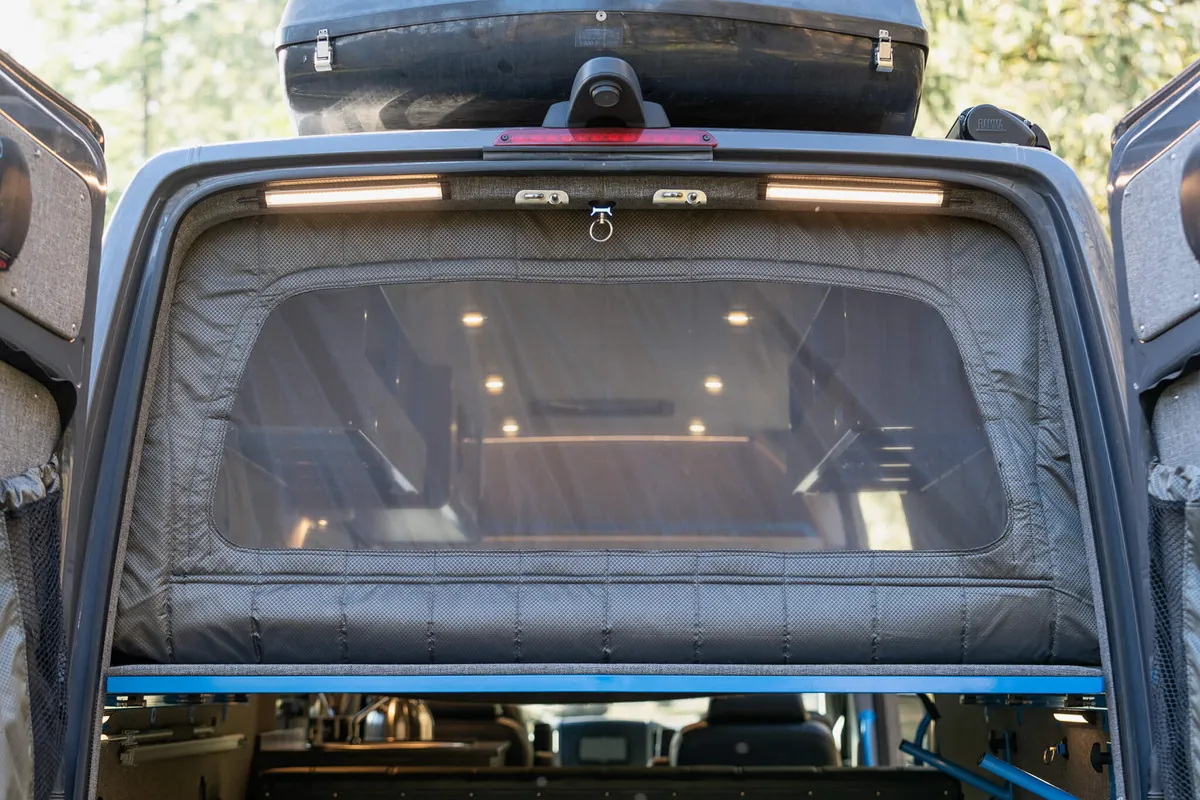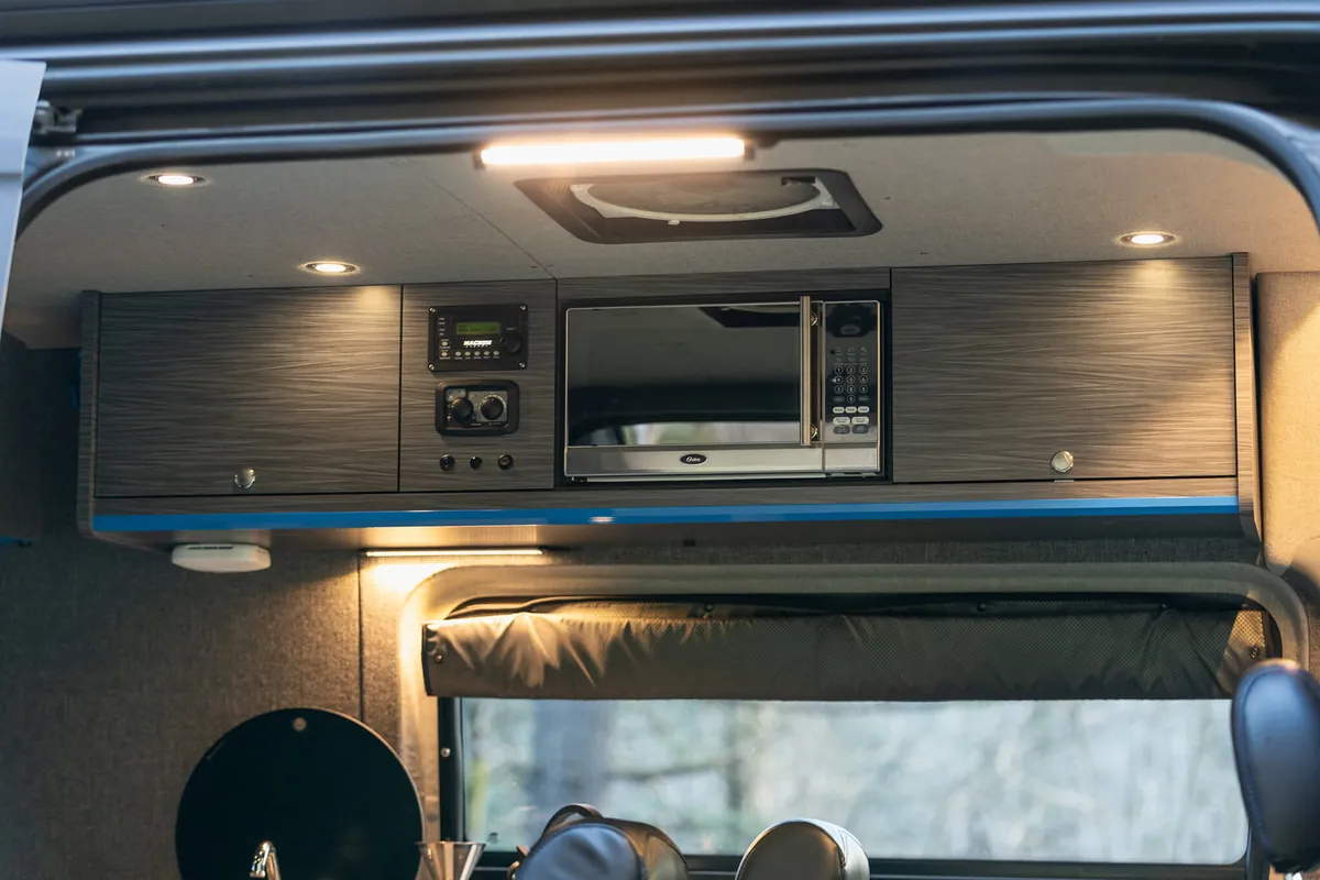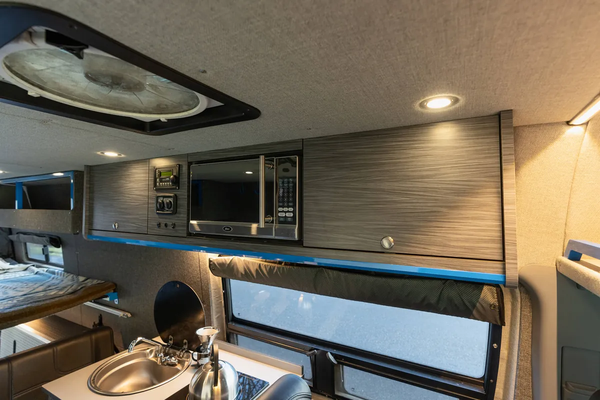 Powering Mt. Adams are two 12V AGM batteries paired with a Magnum 1000W inverter. The Webasto Dual Top Diesel heating system provides heat and hot water, with a 20 gallon freshwater tank and an exterior shower with a magnetic shower curtain for the rear doors.