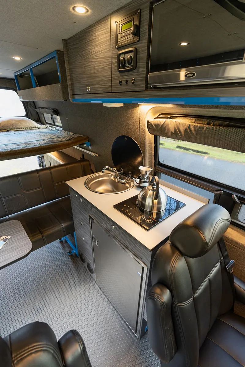 Built in 2017, Mt. Adams is a mountain-ready 4WD Sprinter 170. With seating for 4 passengers (2 of which are removable in case you need more space!), taking the whole crew on trips is easy. The queen-sized upper bed is spacious enough for 2, and the lower bench is removable and folds over to make a lower sleeping area. With a microwave, cooktop, sink, fridge, and lots of cabinet storage space in the kitchen, making meals on the road is easy. The rear garage area includes removable ski storage, as well as bike mounts for up to 3 bikes.