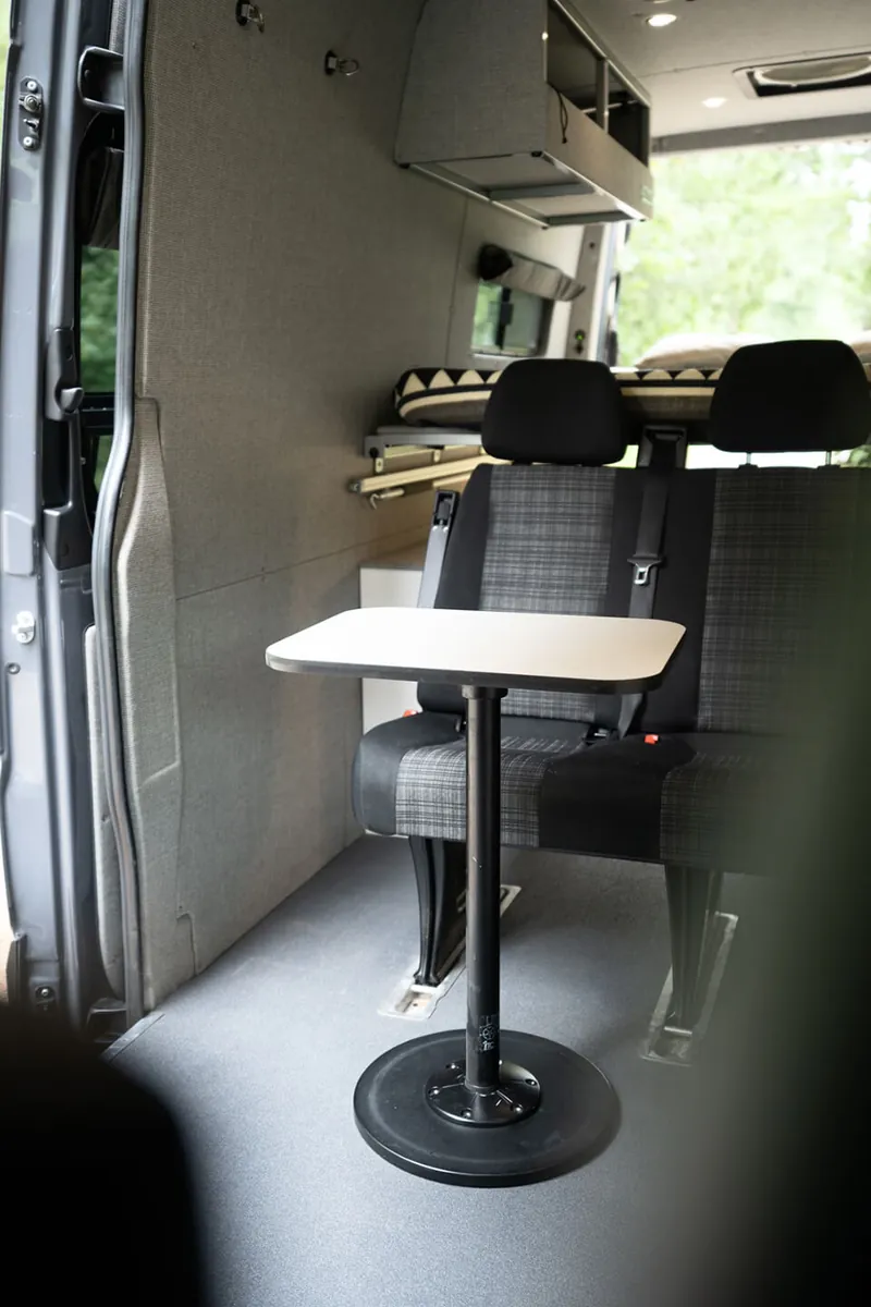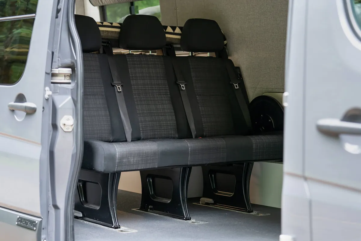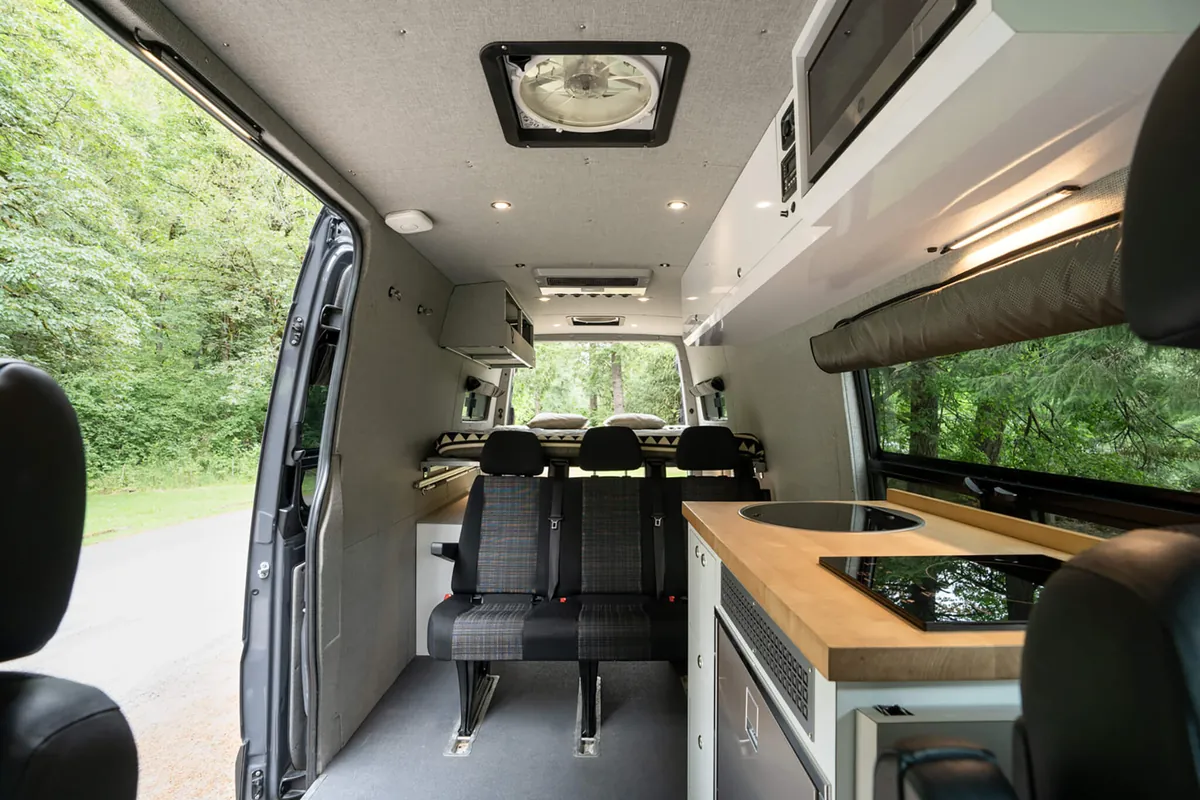 Ski Bird is a Graphite Grey 2017 Mercedes-Benz built to be enjoyed during all four seasons! With seating for five and sleeping for two, Ski Bird is the perfect van to use when taking friends and family up the mountain for some fresh powder. The 3-person DOT-approved bench is removable, opening so much internal space for hauling gear like e-bikes or surfboards. Complete with a 20-gallon freshwater tank, Ski Bird’s galley kitchen features an induction cooktop, refrigerator, sink, flip up table, removable table on locking marine base system, overhead microwave, and dedicated storage drawers. Stay cool during warm afternoons with a 12V aftermarket roof-top air conditioning unit able to run off engine or shore power.