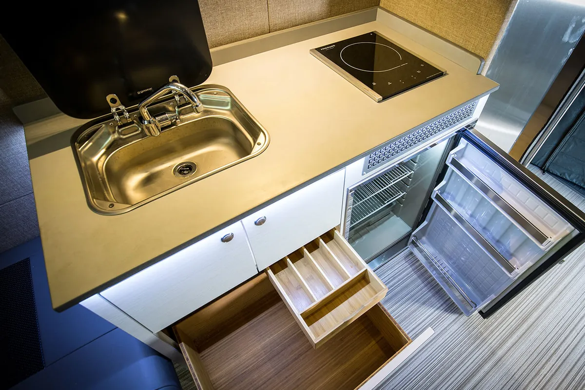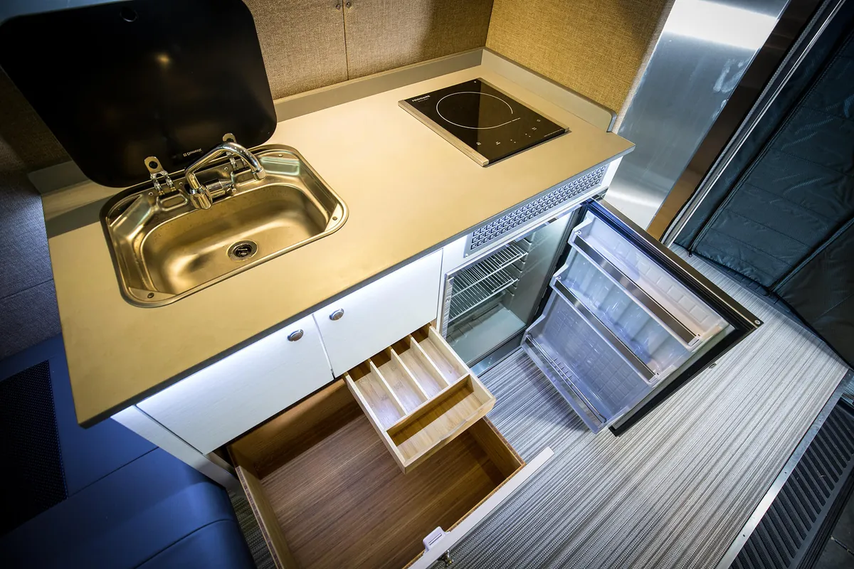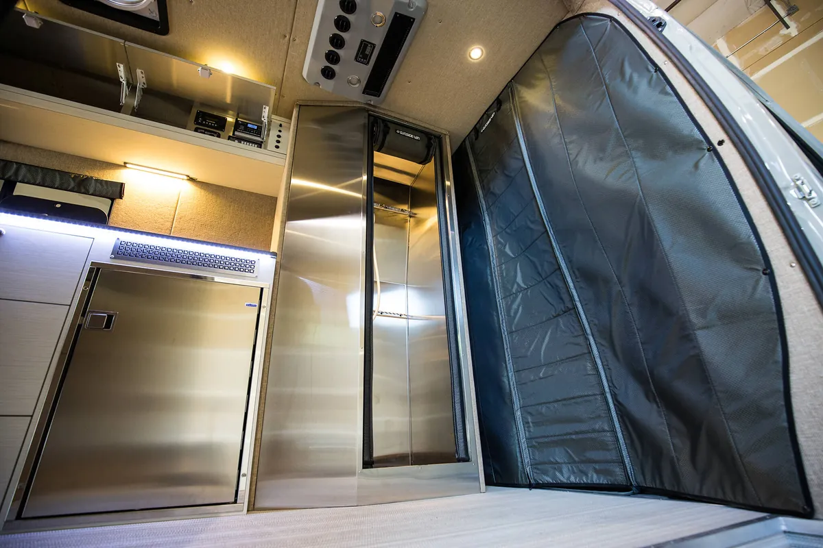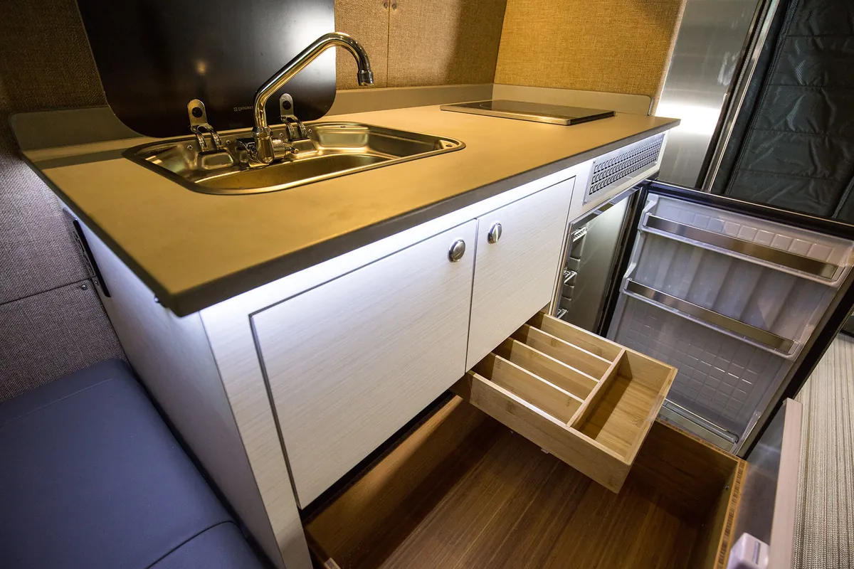 Our custom Sprinter vans are engineered with the perfect blend of ruggedness and comfort, specifically crafted to accommodate your trail running gear and provide a comfortable space for rest and recovery after you finish a run. With specialized storage solutions for trail running camping trips, your van transforms into not just transportation but also a mobile base camp to keep clean, relax, and refuel.