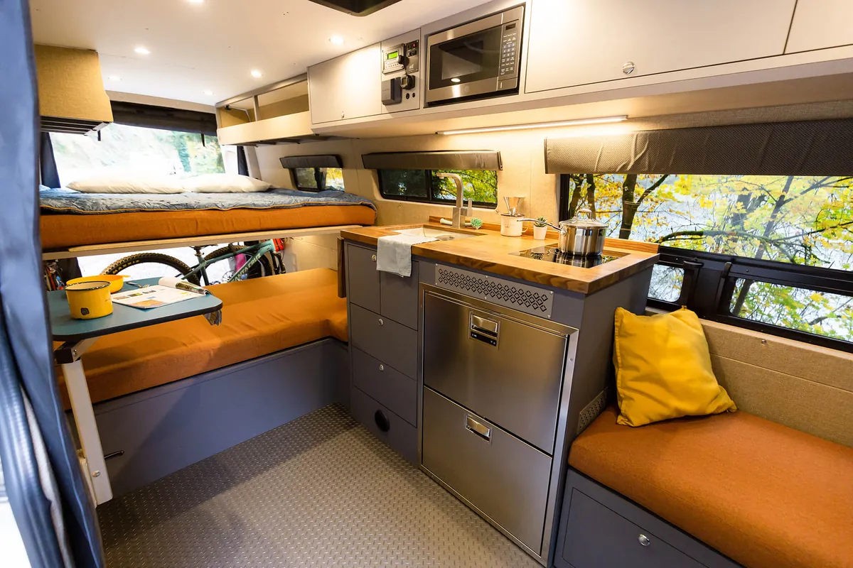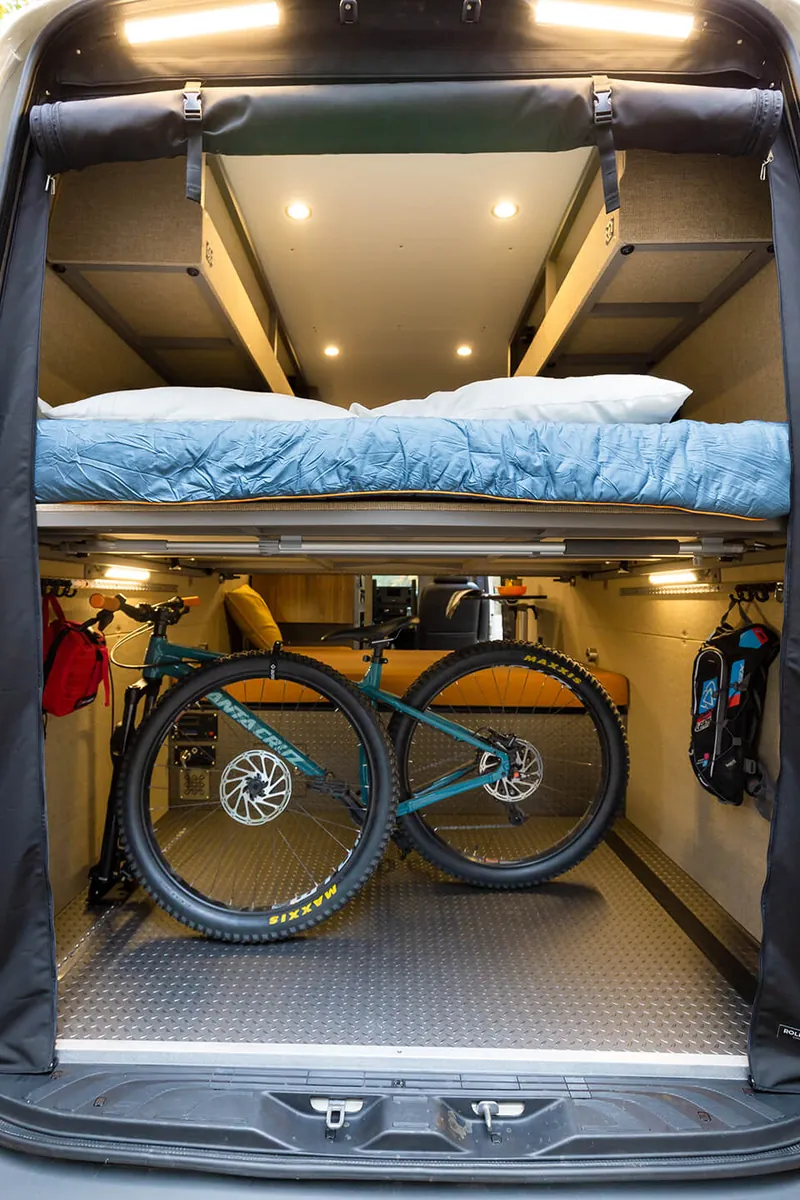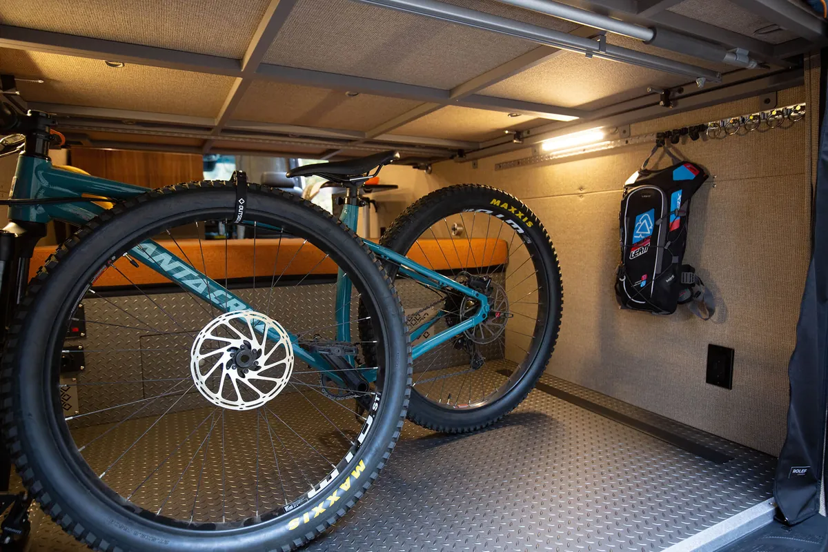 Powered by a lithium ion power system with a secondary alternator that directly charges the house batteries while the van’s idle or in motion, the microwave, fridge/freezer combo, cooktop, lights, vents, and outlets can be used off-grid for days. The cabin has on-demand warm air thanks to the Webasto diesel heater, and the water is heated by an Espar diesel heat system. With a rear shower hookup, cleaning off bikes and bodies after a long day of exploring couldn’t be easier.