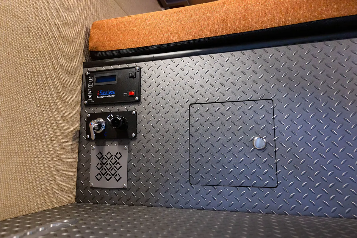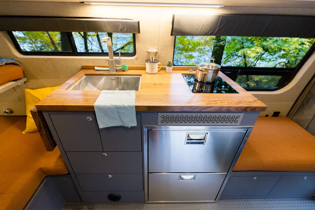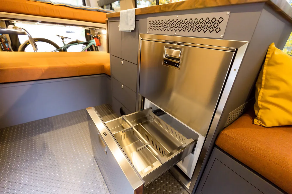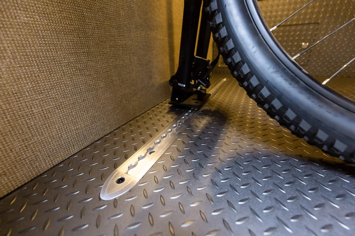 Powered by a lithium ion power system with a secondary alternator that directly charges the house batteries while the van’s idle or in motion, the microwave, fridge/freezer combo, cooktop, lights, vents, and outlets can be used off-grid for days. The cabin has on-demand warm air thanks to the Webasto diesel heater, and the water is heated by an Espar diesel heat system. With a rear shower hookup, cleaning off bikes and bodies after a long day of exploring couldn’t be easier.