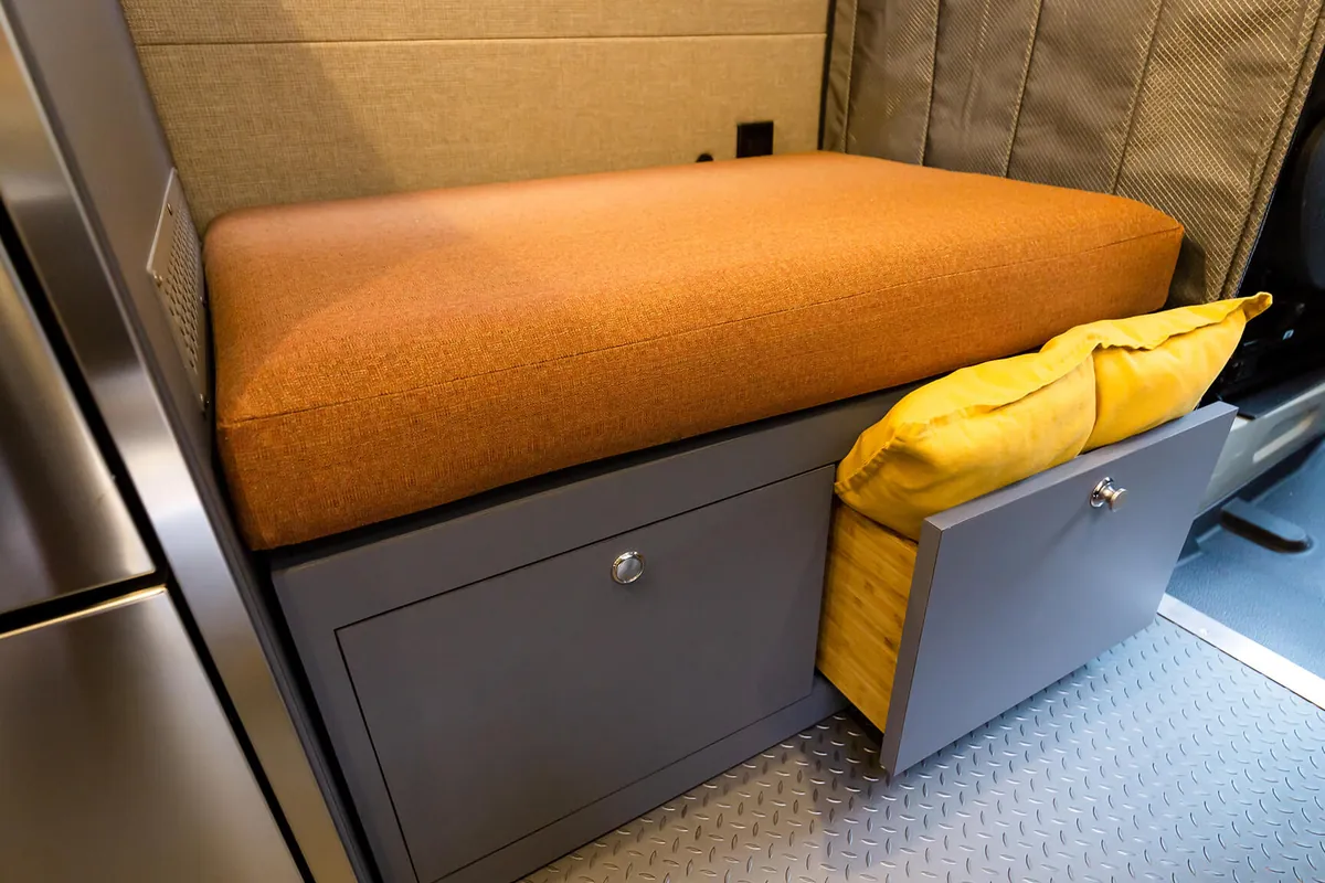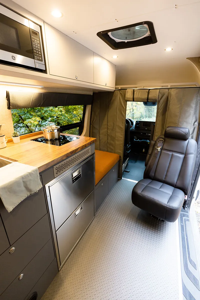 Built in 2020, Woodside is a custom-made van that will take its owners to off-grid camping and biking locations across the Pacific Northwest. With a third removable passenger seat, plenty of comfy seating areas, tons of storage space, and a fully stocked kitchen, this rig is ready for any length of adventure.