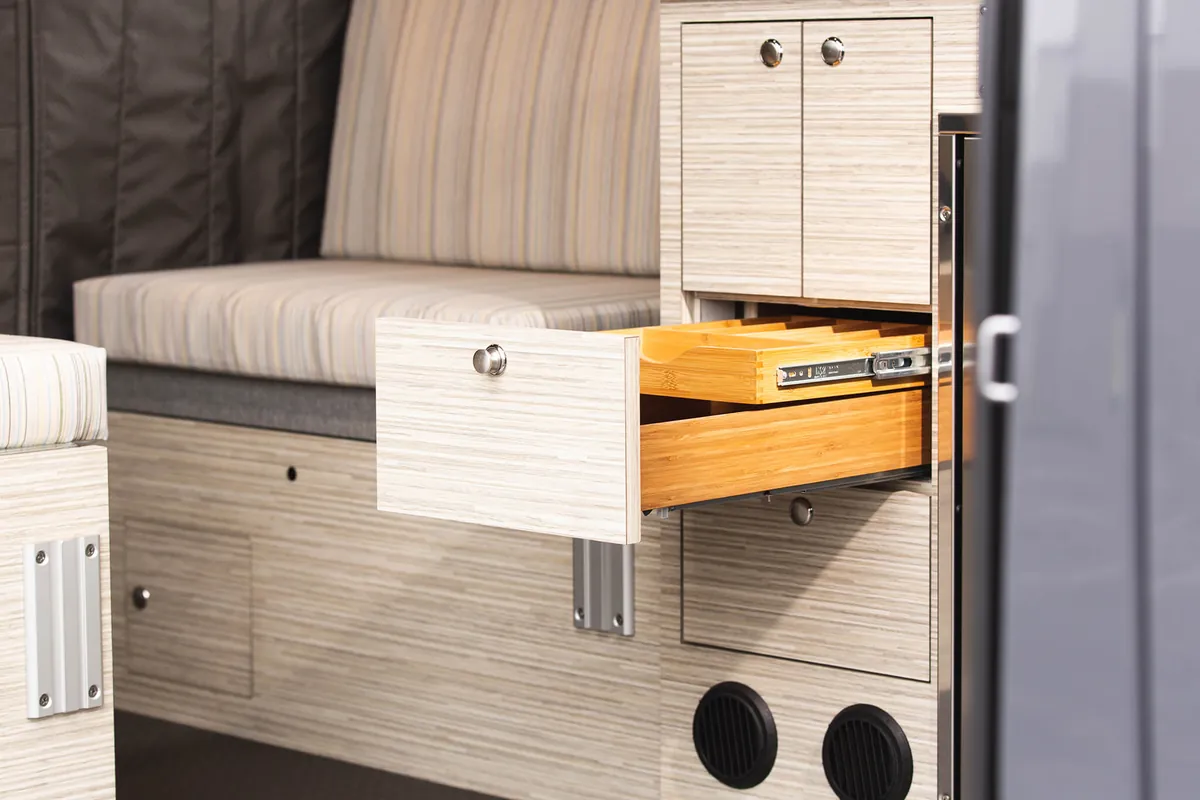 Built in 2018, Wy’East is a Peak Series custom build that was specifically designed for our customers who wanted a comfortable place to sit while hanging out in their van. This wide, two seat dinette area provides a space to eat and relax, but also slides out into a convenient sleeping area.